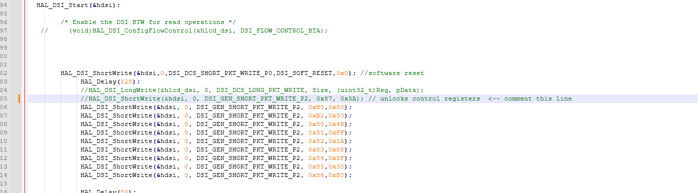 Commenting out this specific DSI command (in this example line 250) that unlocks the panel control registers: