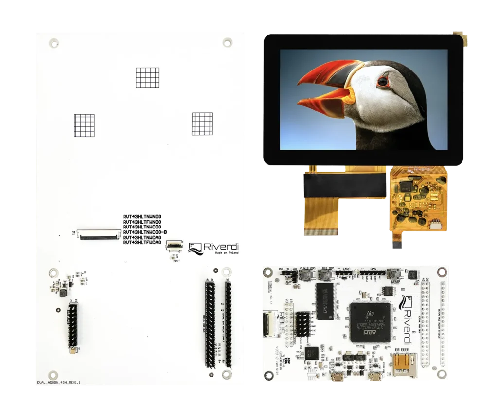 The evaluation board can use either RiBUS to drive the display with EVE graphics controller or the RGB extension. An add-on board, apart from delivering signals to the display, plays a role of a physical carrier to the whole module. Therefore, add-on boards must be customized to the displays they are serving.